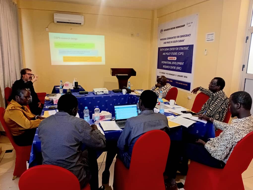 On Thursday, 22 January 2026, the one day joint CSPS-Sudd Institute collaboration meeting on the IDRC Project was convened at Imperial Plaza Hotel, Juba, attended by senior management, researchers, and staff of the two think tanks. The workshop covered areas of possible collaboration during the implementation of the project. Some of the areas discussed included, but it is not limited to the theory of change, research questions, methodologies, research sites, outcomes, outputs, timeline, and policy engagement strategy. The workshop also looked at the mapping connection points in research and possibilities for collaboration in areas such as overlaps in objectives, research questions, complimentary cases (research sites), methodologies, opportunities for joint research, collaborative knowledge generation (e.g., policy briefs), comparative analysis, and learning on research findings and data sharing (aligning with research ethics).